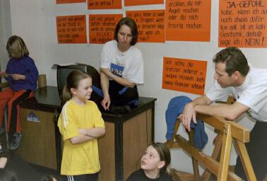 Mit Körpersprache Signale setzen. In der Praxis sieht das folgendermaßen aus: gemeinsam mit ihrer Freundin Saskia versucht Nicole, der Erfolgstrainerin in die Augen zu schauen, ohne als erste den Blick abzuwenden. Direkten Blickkontakt mit anderen Menschen zu halten ist eine Anfangsübung im Mädchenkurs. Die Erfolgstrainerin wiederholt mit leiser, aber energischer Stimme die Aufgabe und führt den Mädchen vor, wie sie mit Hilfe der Körpersprache deutliche Signale setzen können.