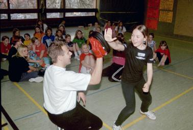 Mit viel Spaß lernt es sich leichter! Mädchen lernen, sich richtig zu wehren. |